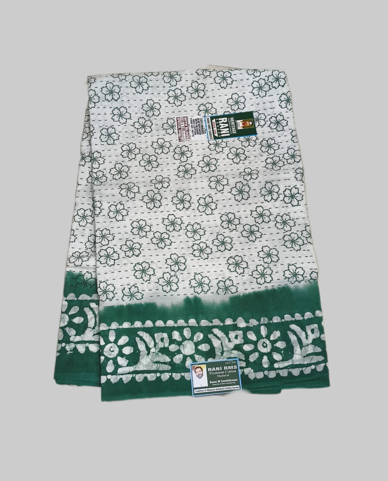 Tags: #borderlesssarees, #heritageranisarees, #raneesungidisarees, #sungudicottonsarees, #Traadition Saree, #withblousesarees, floral sarees, rani1948