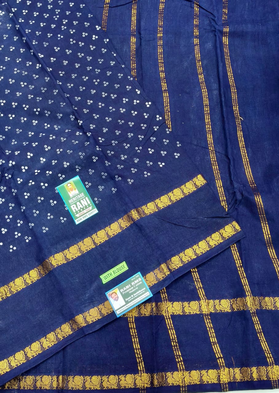 Categories: 7 Yards, Colours, Double Side Zari, Navy Blue, Patterns, Plain & Tradition Sarees, Price Range, Rani Superior, Rs.1300 and Above, Sungudi Collections, Type of Borders, With Blouse (SR), With Jari (SR)