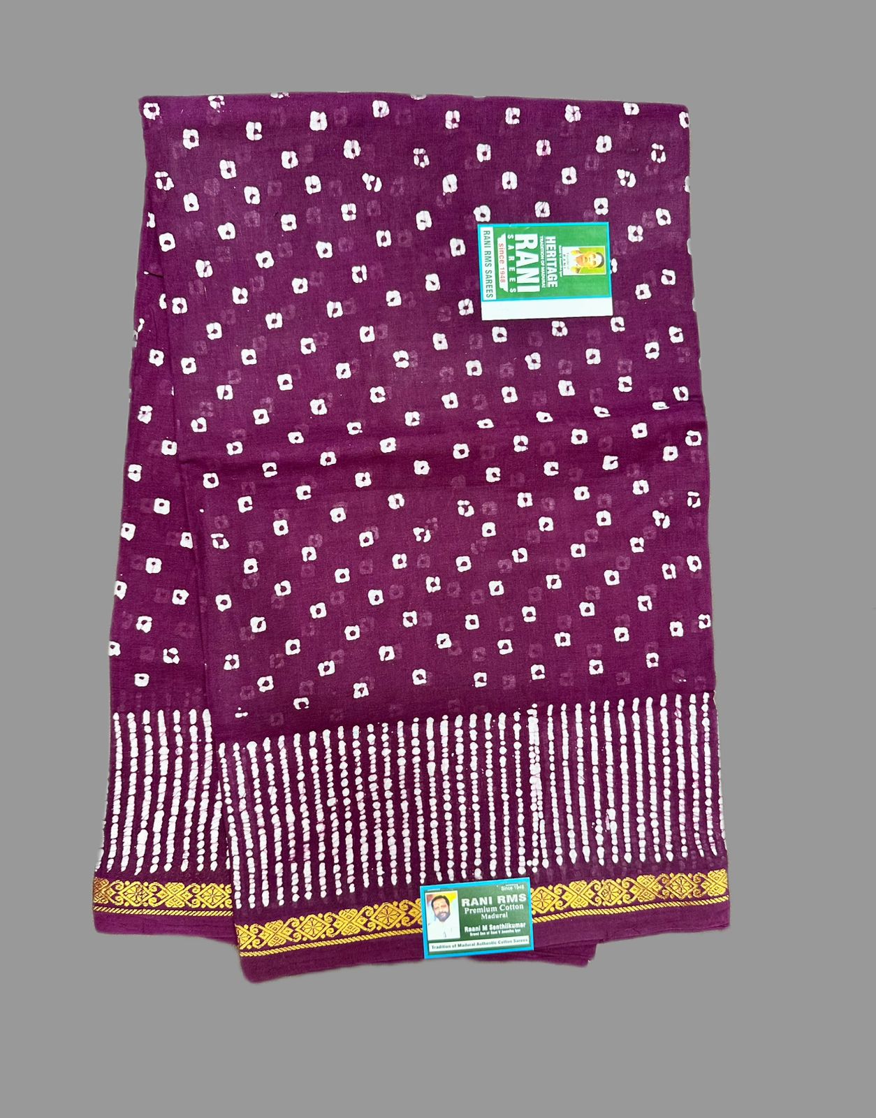 Categories: 6 Yards, Bathic Sarees, Colours, Double Side Zari, Patterns, Price Range, Purple, Rani Premium, Rs 1100 to Rs 1300, Sungudi Collections, Type of Borders, With Jari Sarees (P)