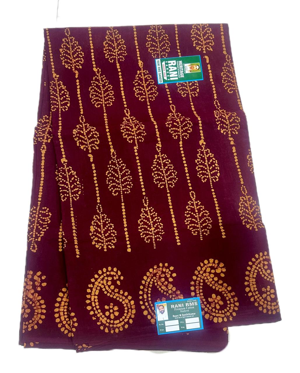 Categories: 6 Yards, Bathic Sarees, brown, Colours, Floral Sarees, Patterns, Price Range, Rani Premium, Rani Soft Cotton, Rs 950 To Rs 1100, Sarees, Soft Cotton, Sungudi Collections, Type of Borders, Without Jari (P)