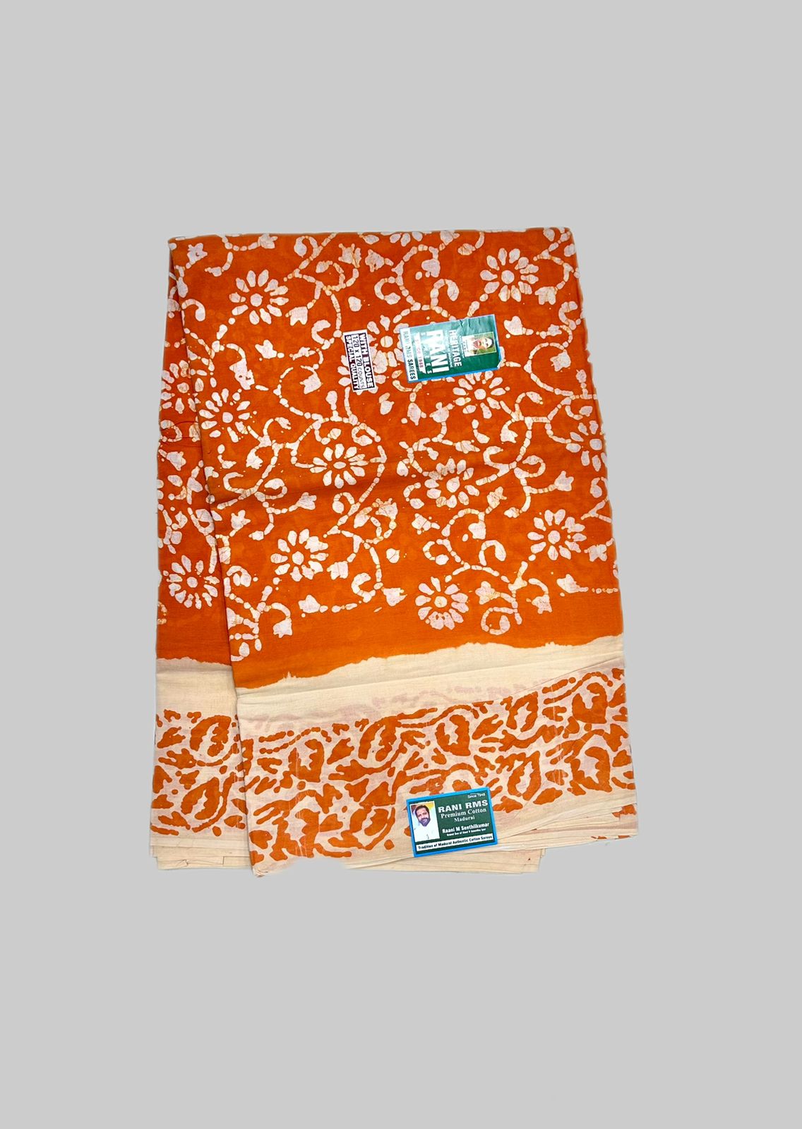 Categories: 7 Yards, Bathic Sarees, Colours, Orange, Patterns, Price Range, Rani Superior, Rs.1300 and Above, Sungudi Collections, Type of Borders, With Blouse (SR), Without Jari (SR)